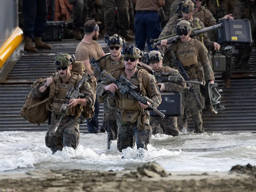 قالت القيادة المركزية الأمريكية إن مشاة البحرية شاركوا في تدريب على متن سفينة الهجوم البرمائي تريبولي في بحر العرب